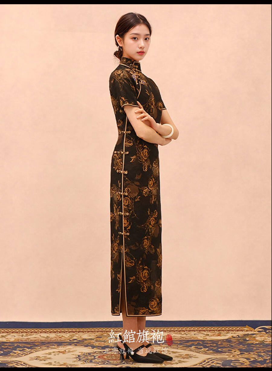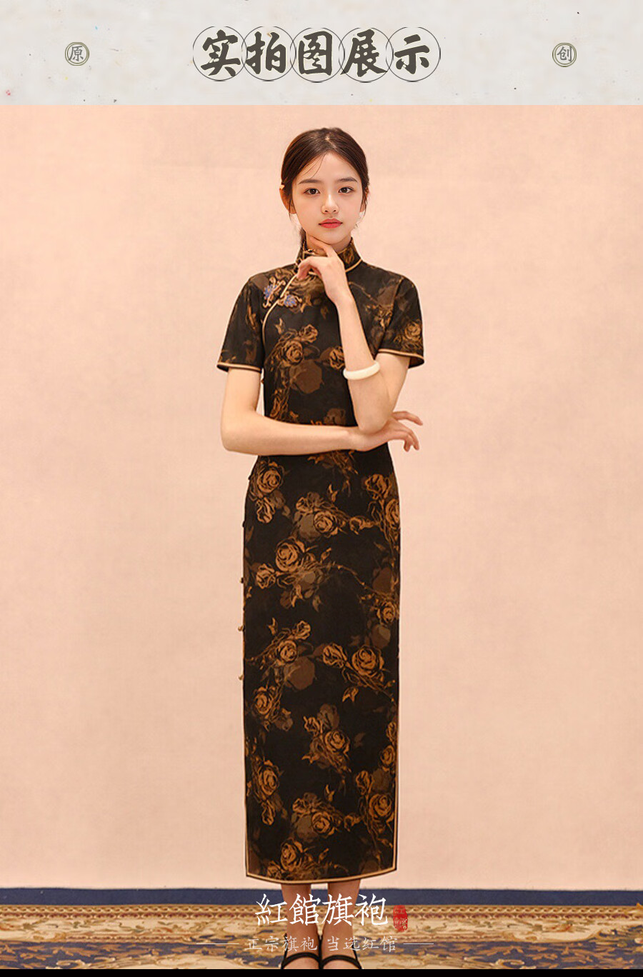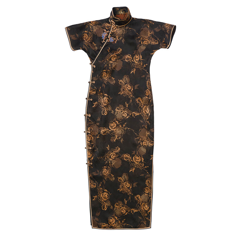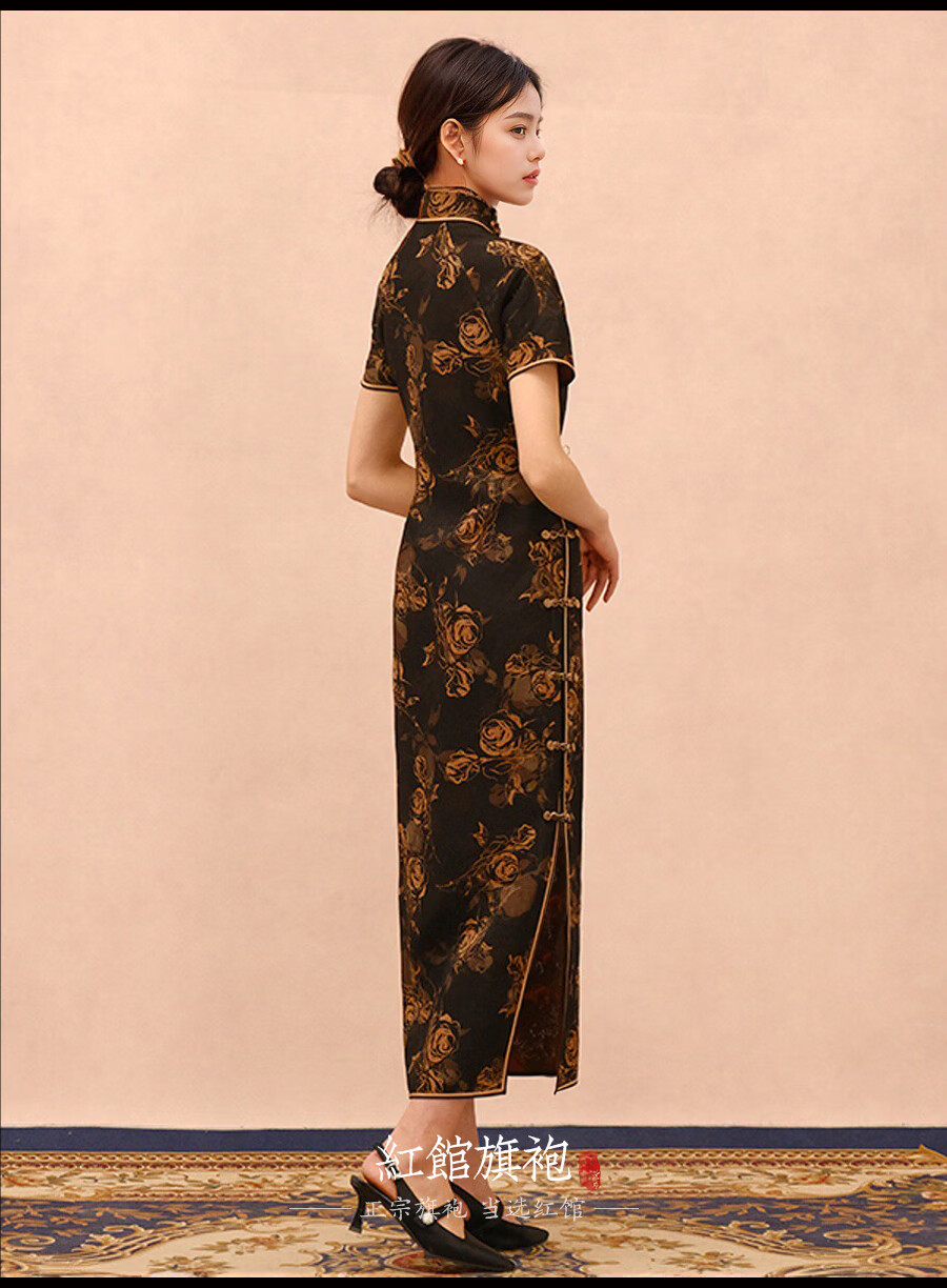 红馆旗袍2025夏季新一片式古法修身款式香云纱高端高级黑色长款旗袍沐栀子 黑色 S