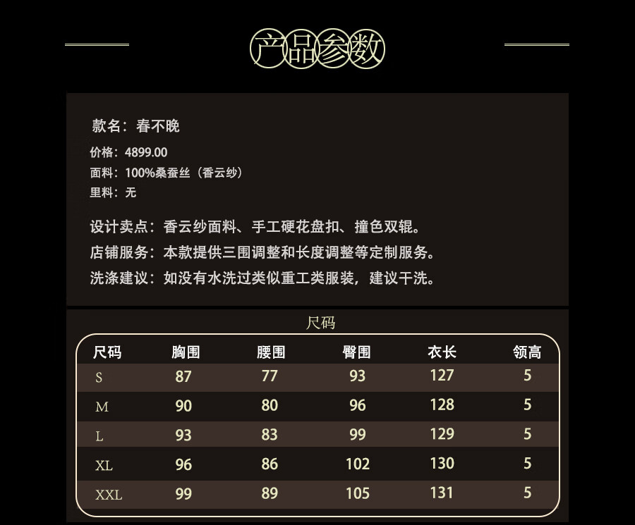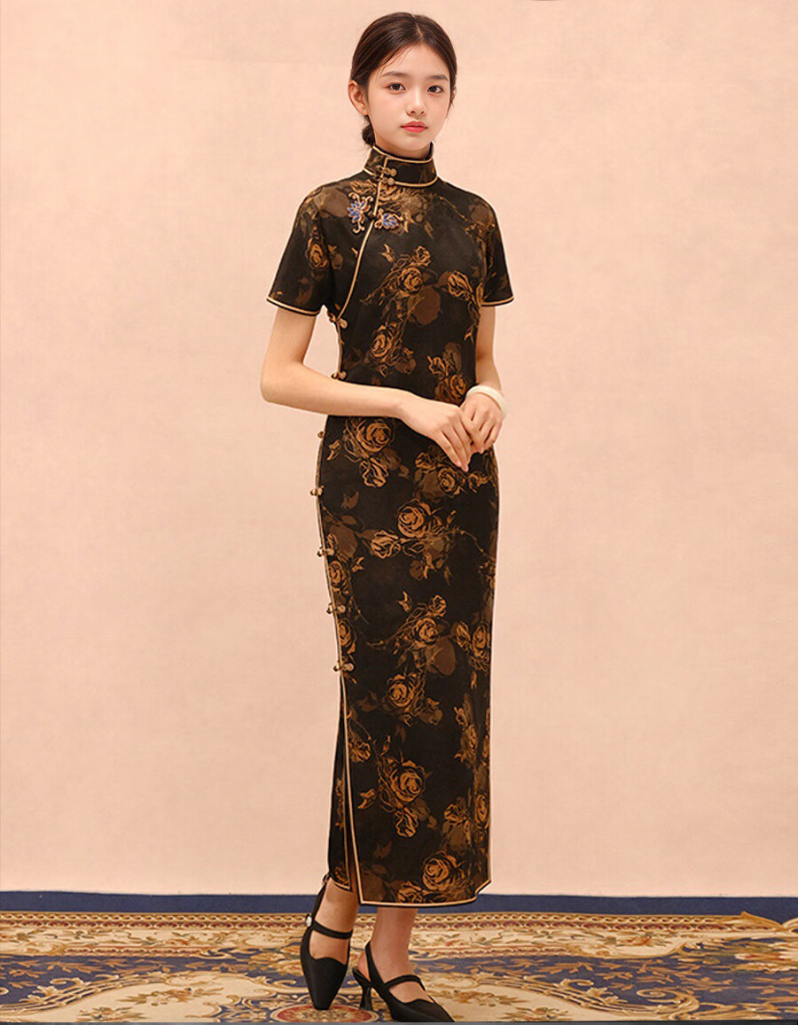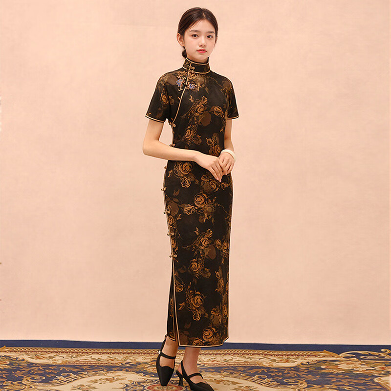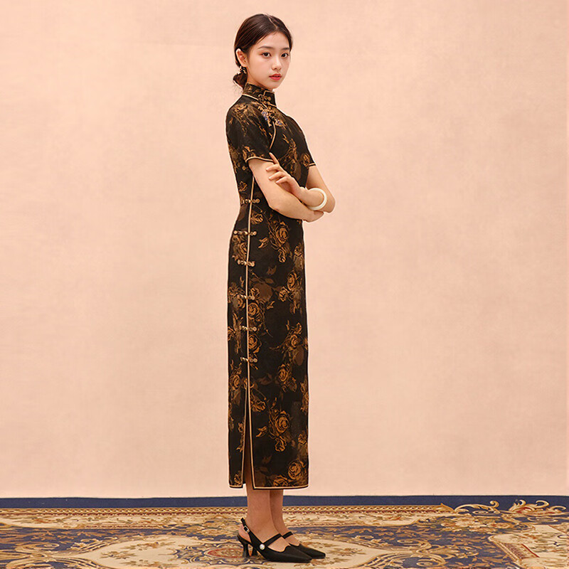 红馆旗袍2025夏季新一片式古法修身款式香云纱高端高级黑色长款旗袍沐栀子 黑色 S