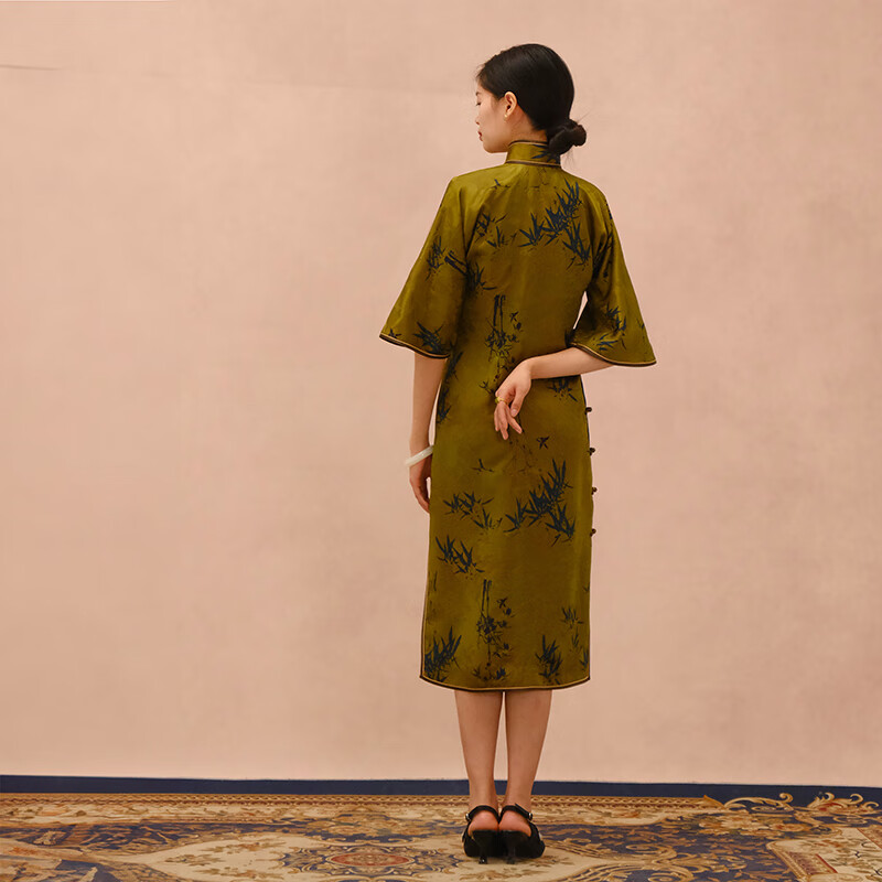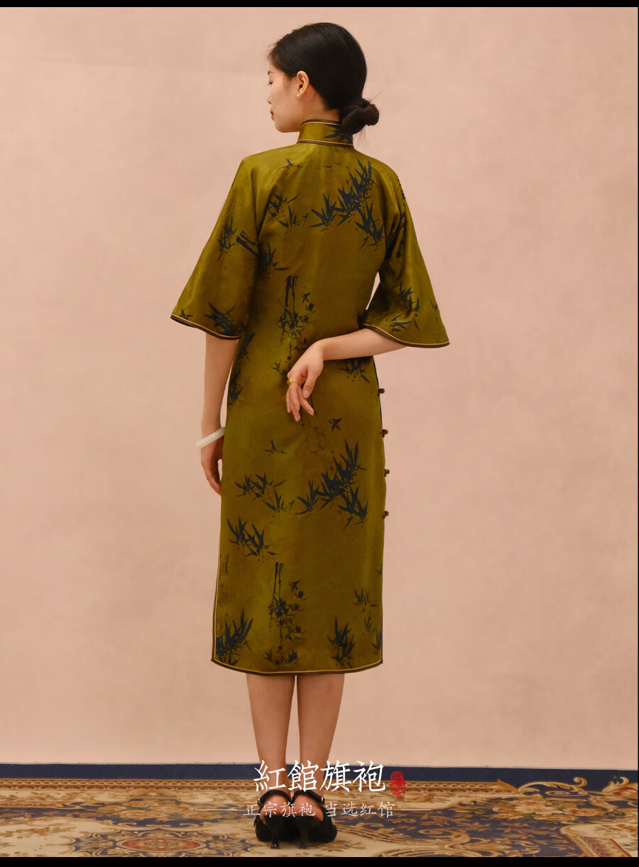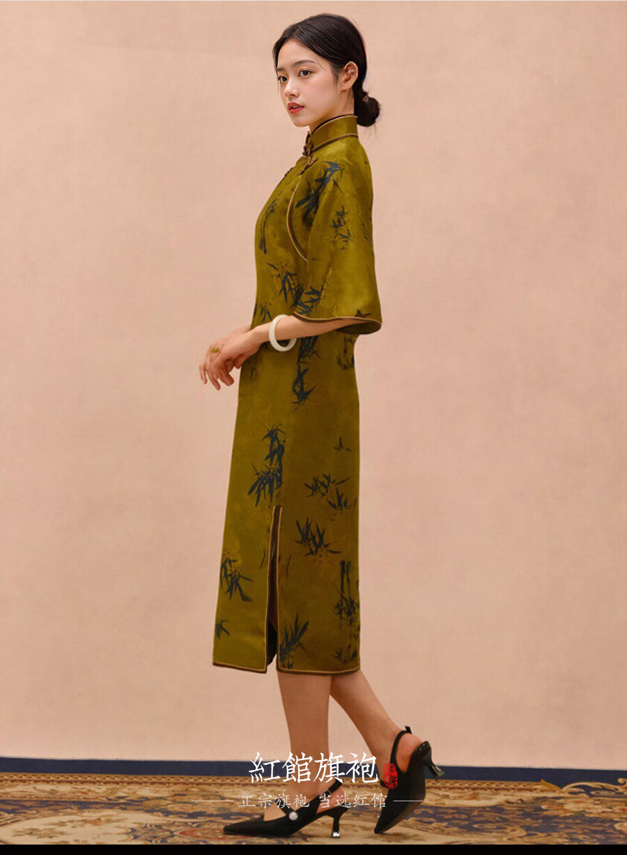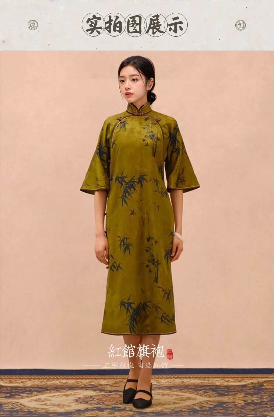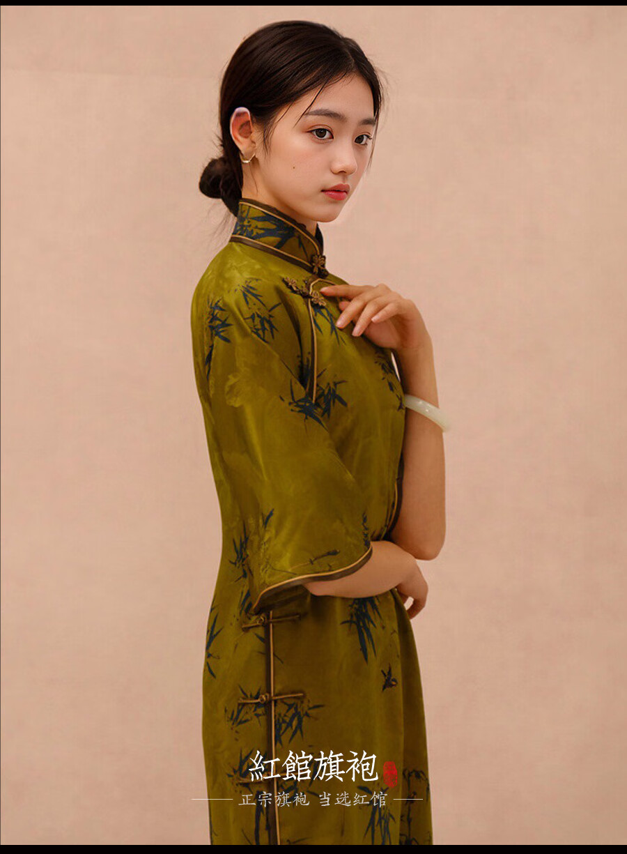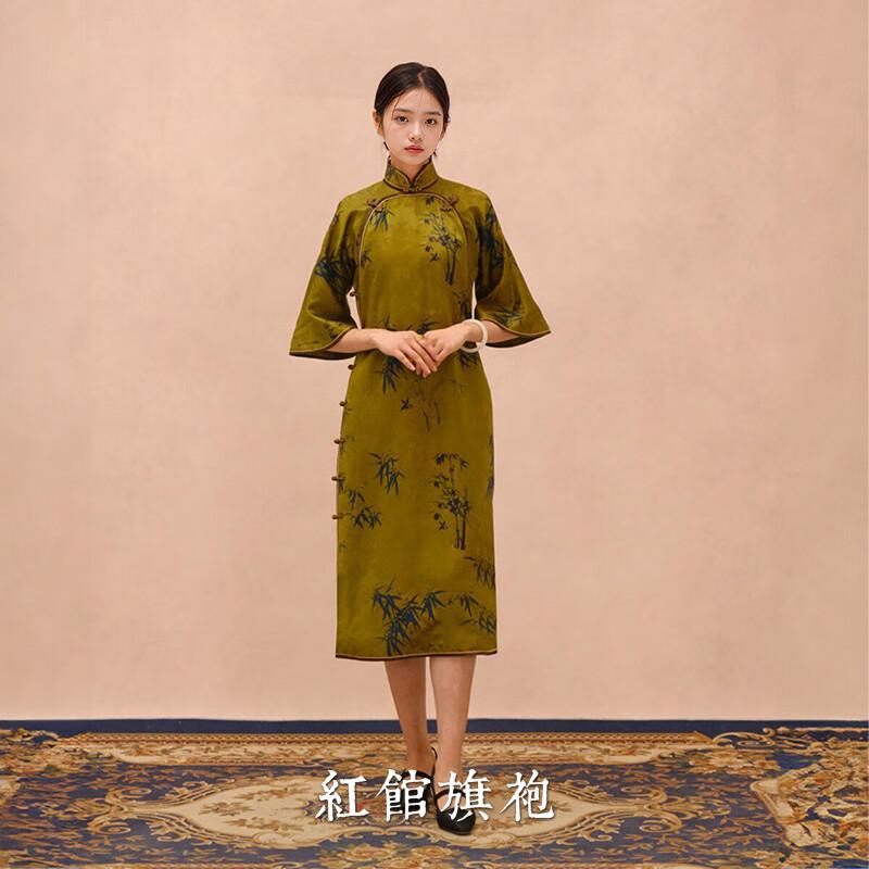 红馆旗袍2025平裁连肩无省收腰真丝提花缎传统复古手工定制旗袍柳条风 绿色 S
