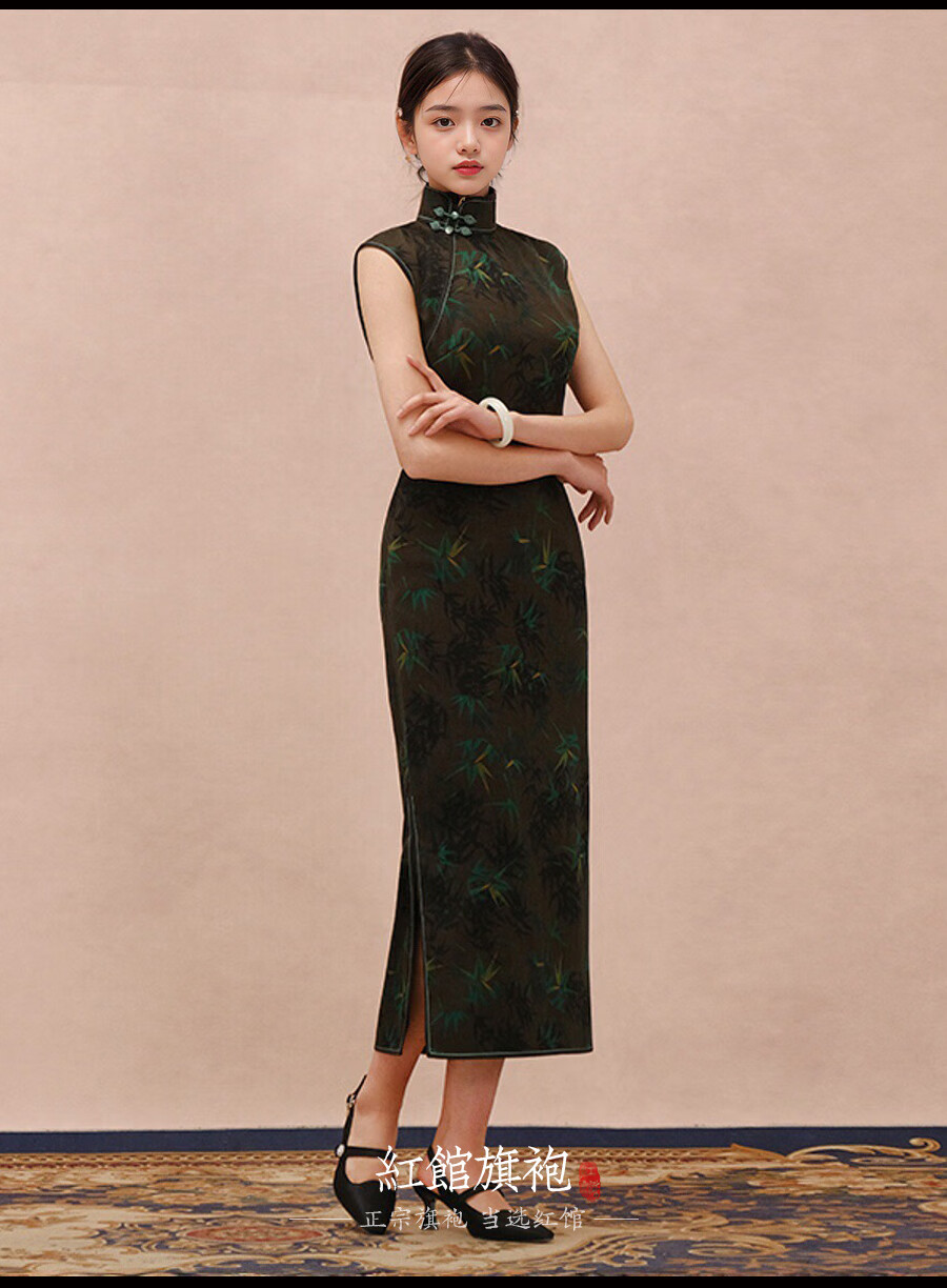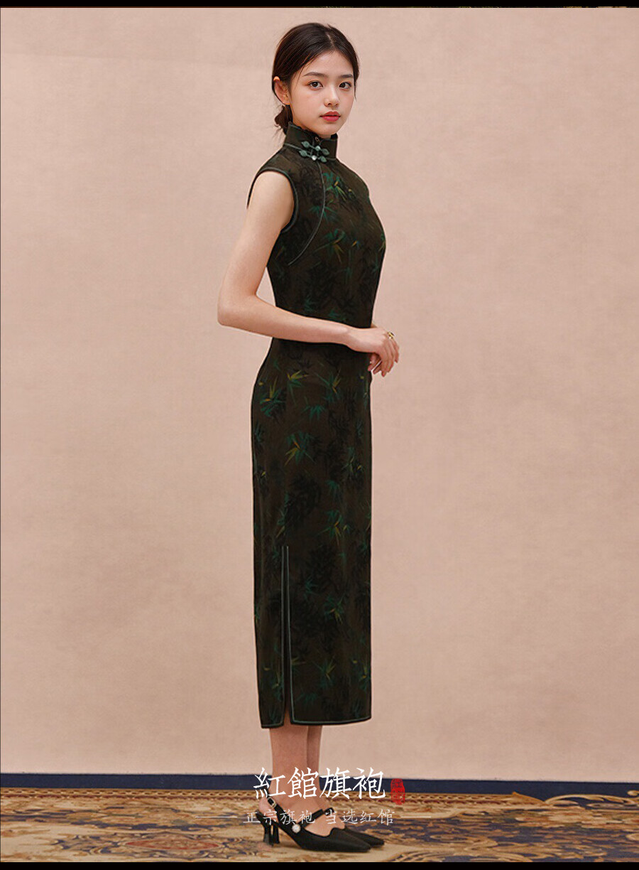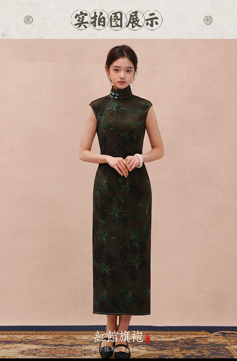 红馆旗袍2025春夏新款高端高贵老料香云纱长款女显身材旗袍墨竹图 绿色 S