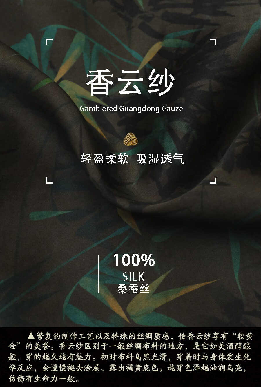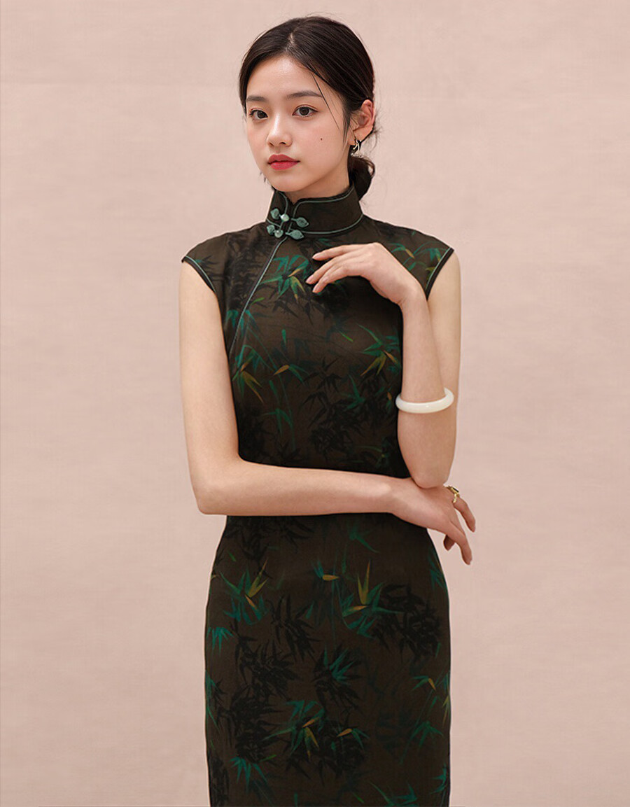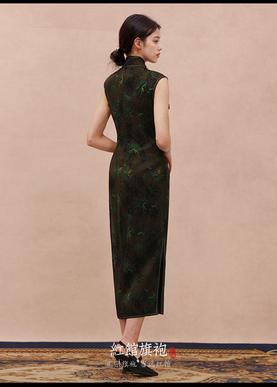 红馆旗袍2025春夏新款高端高贵老料香云纱长款女显身材旗袍墨竹图 绿色 S