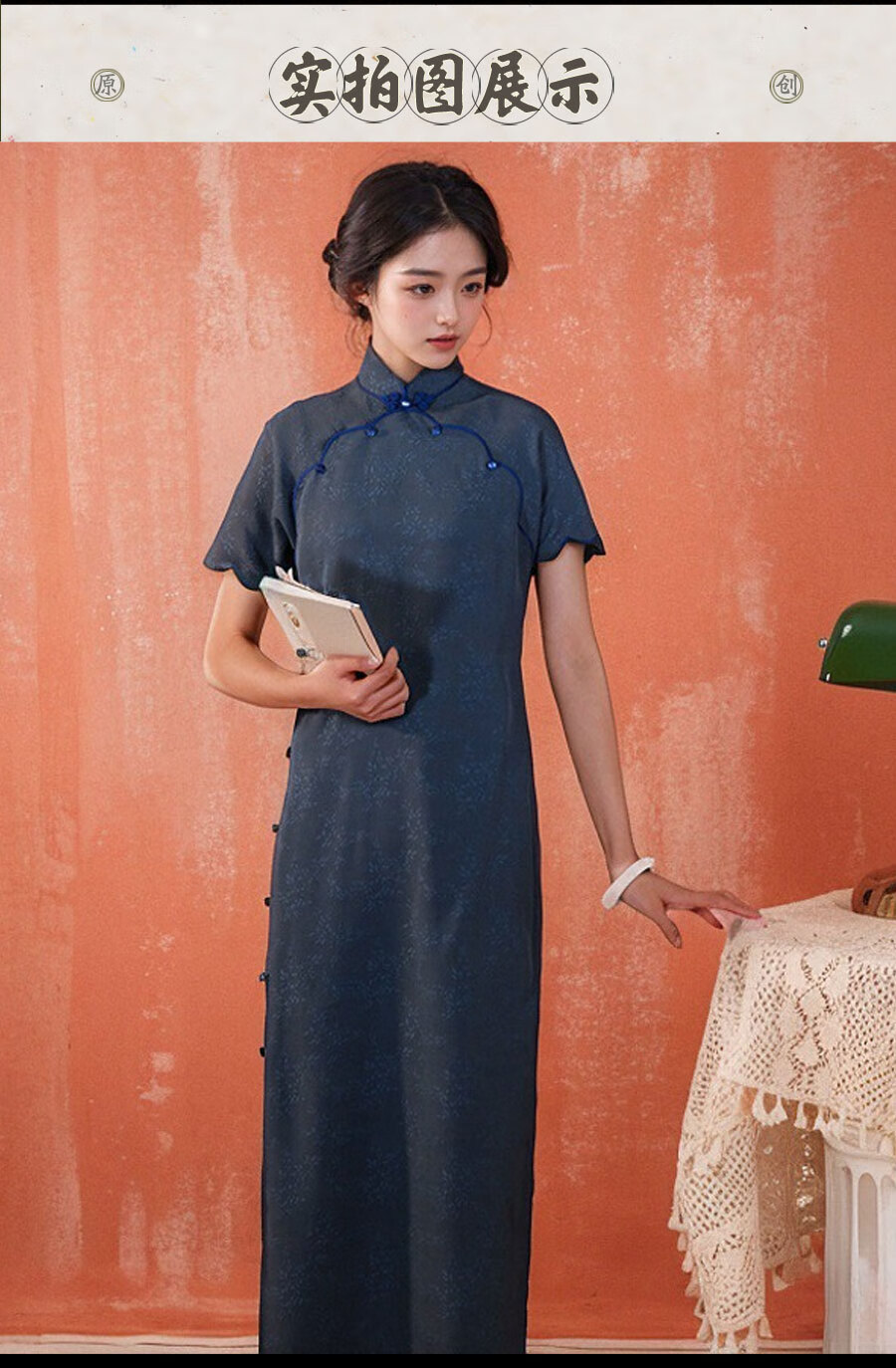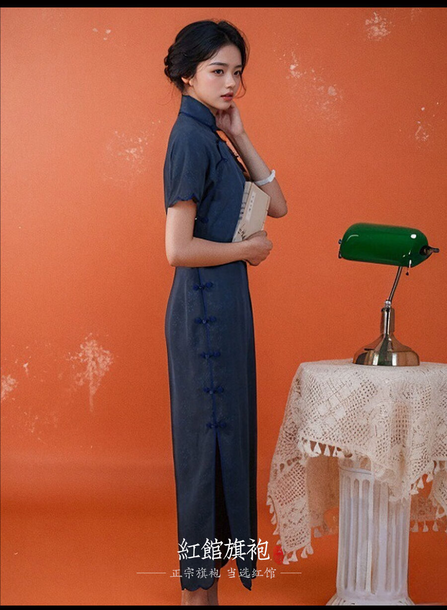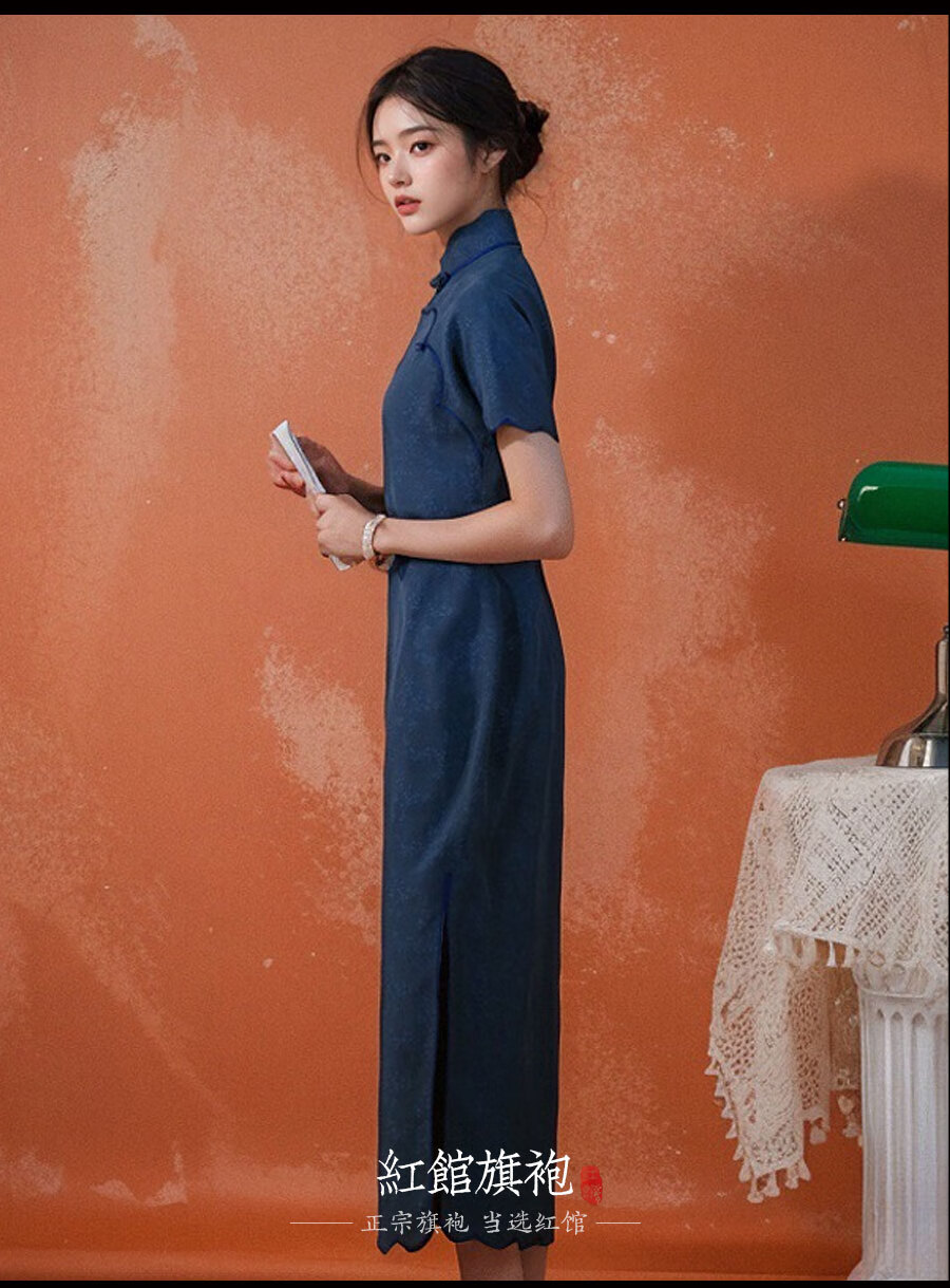 红馆旗袍2025春夏新长款香云纱老式古法民国复古传统香云纱旗袍探春令 深蓝色 S