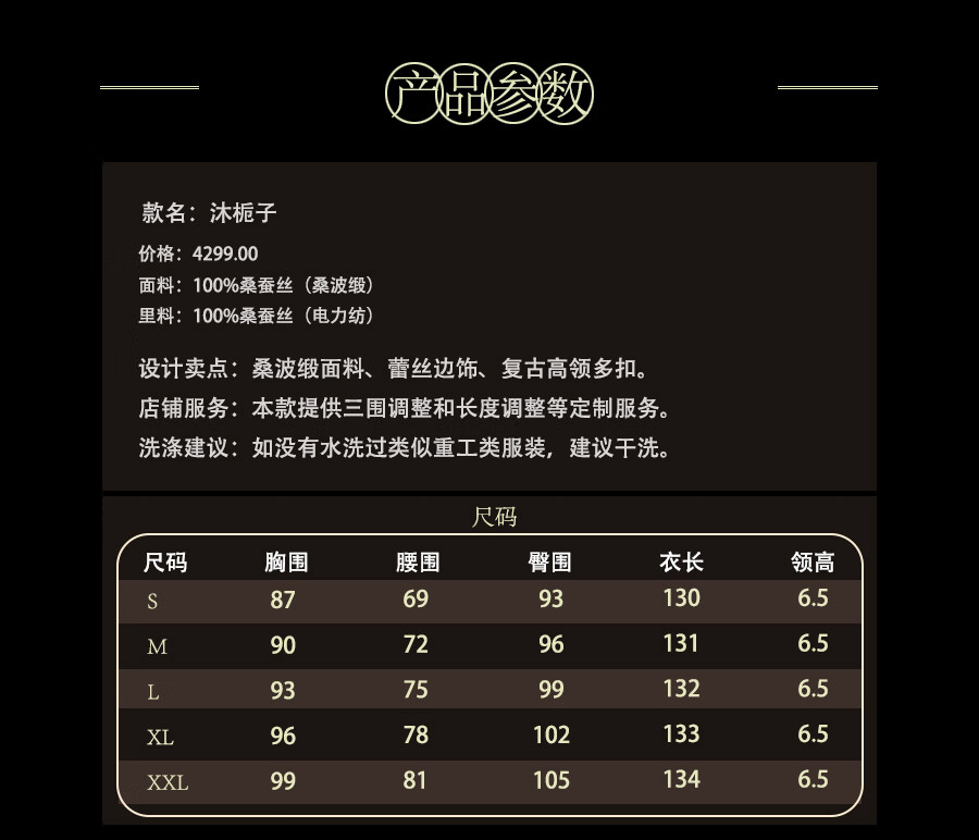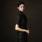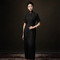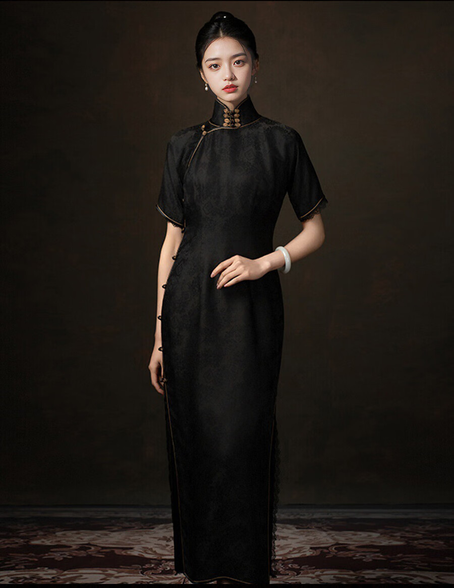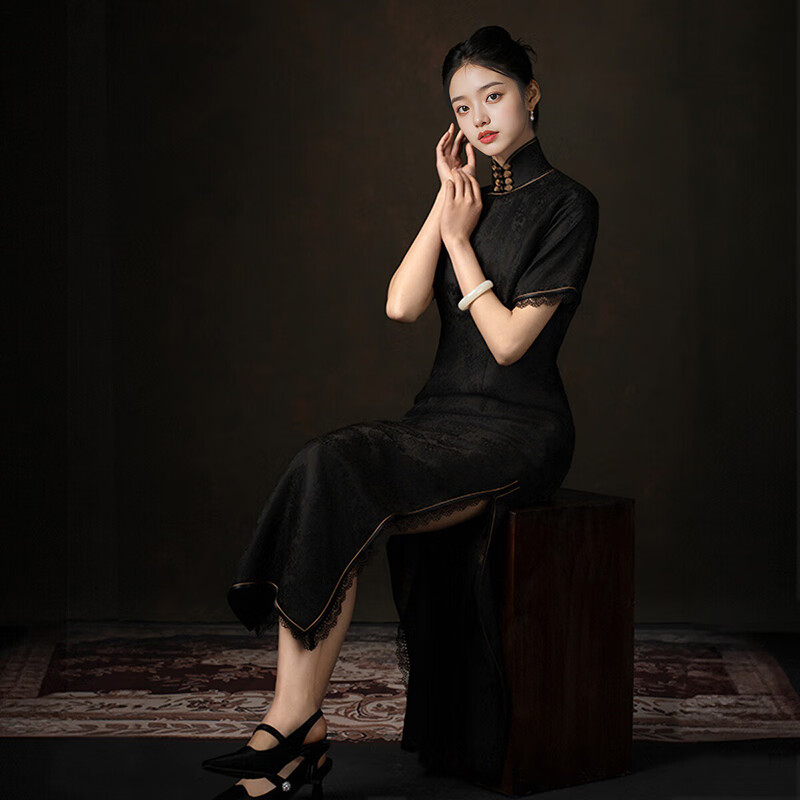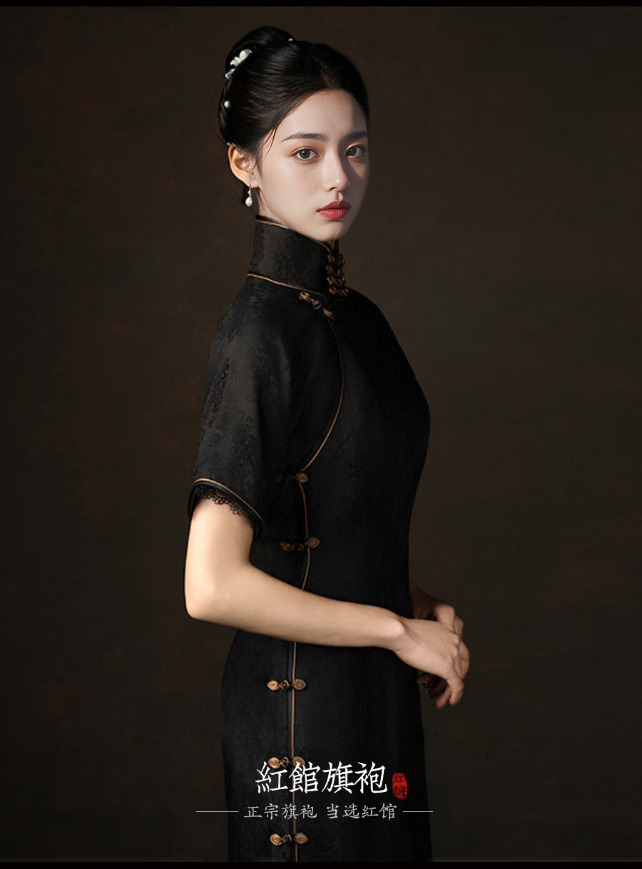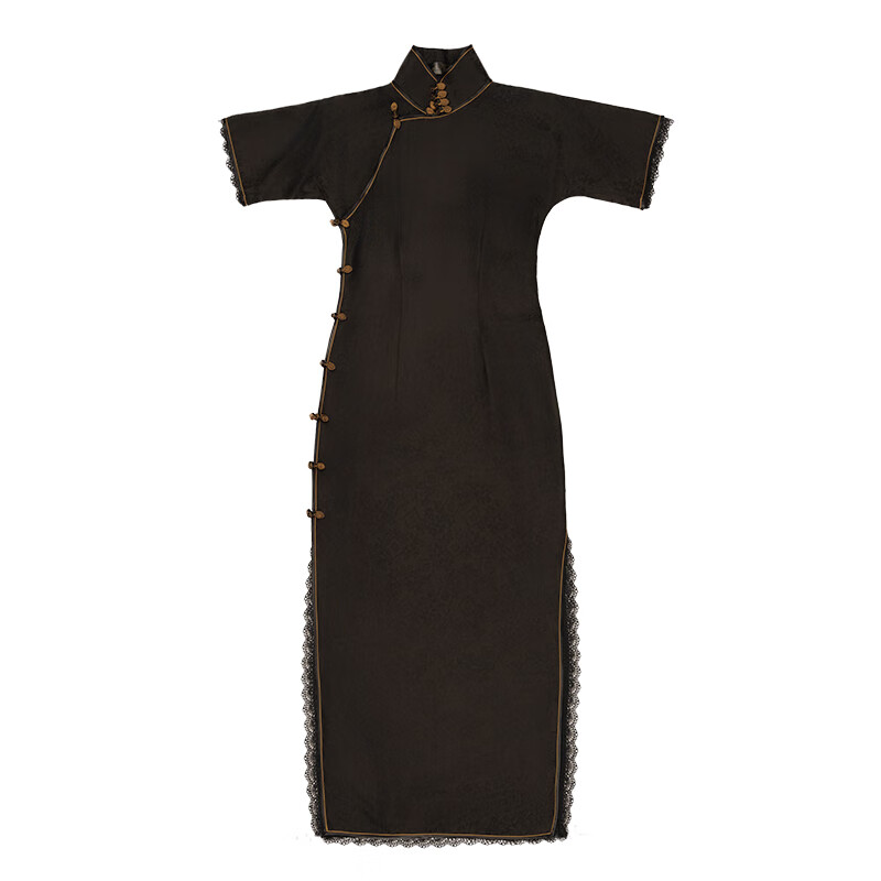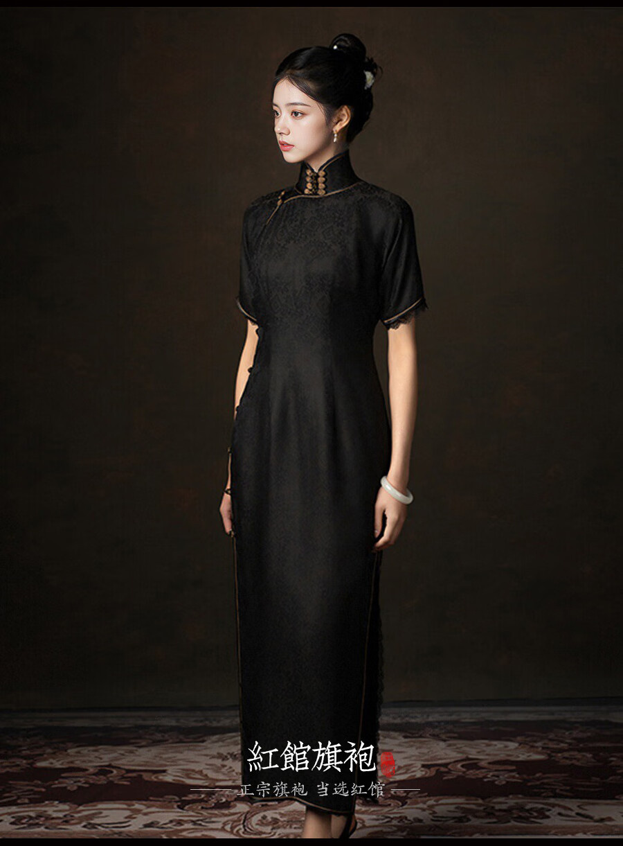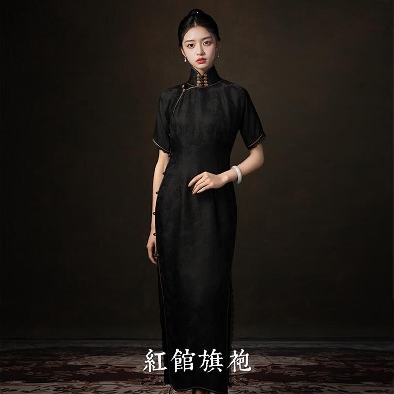 红馆旗袍2025夏季新一片式古法修身款式香云纱高端高级黑色长款旗袍沐栀子 黑色 S