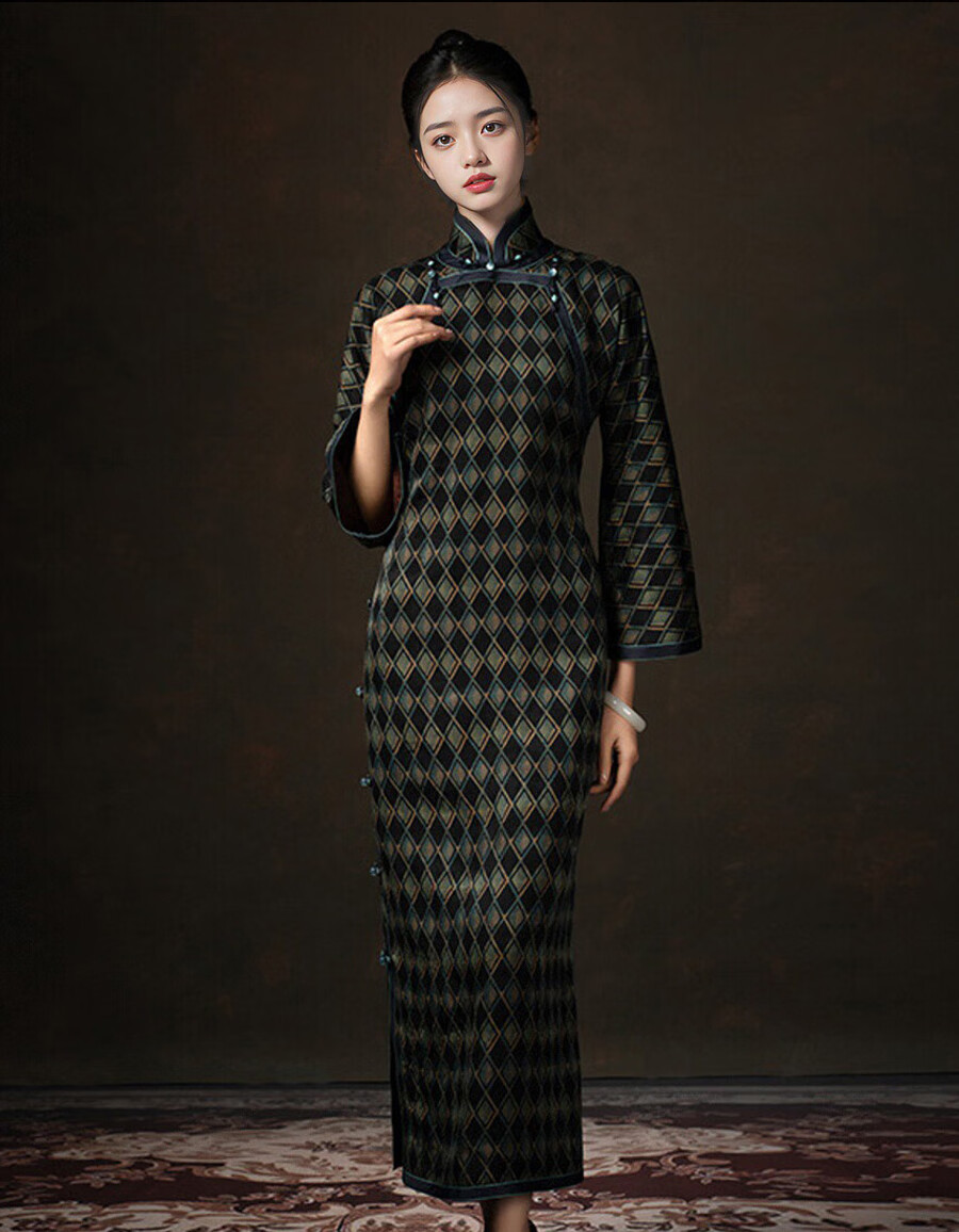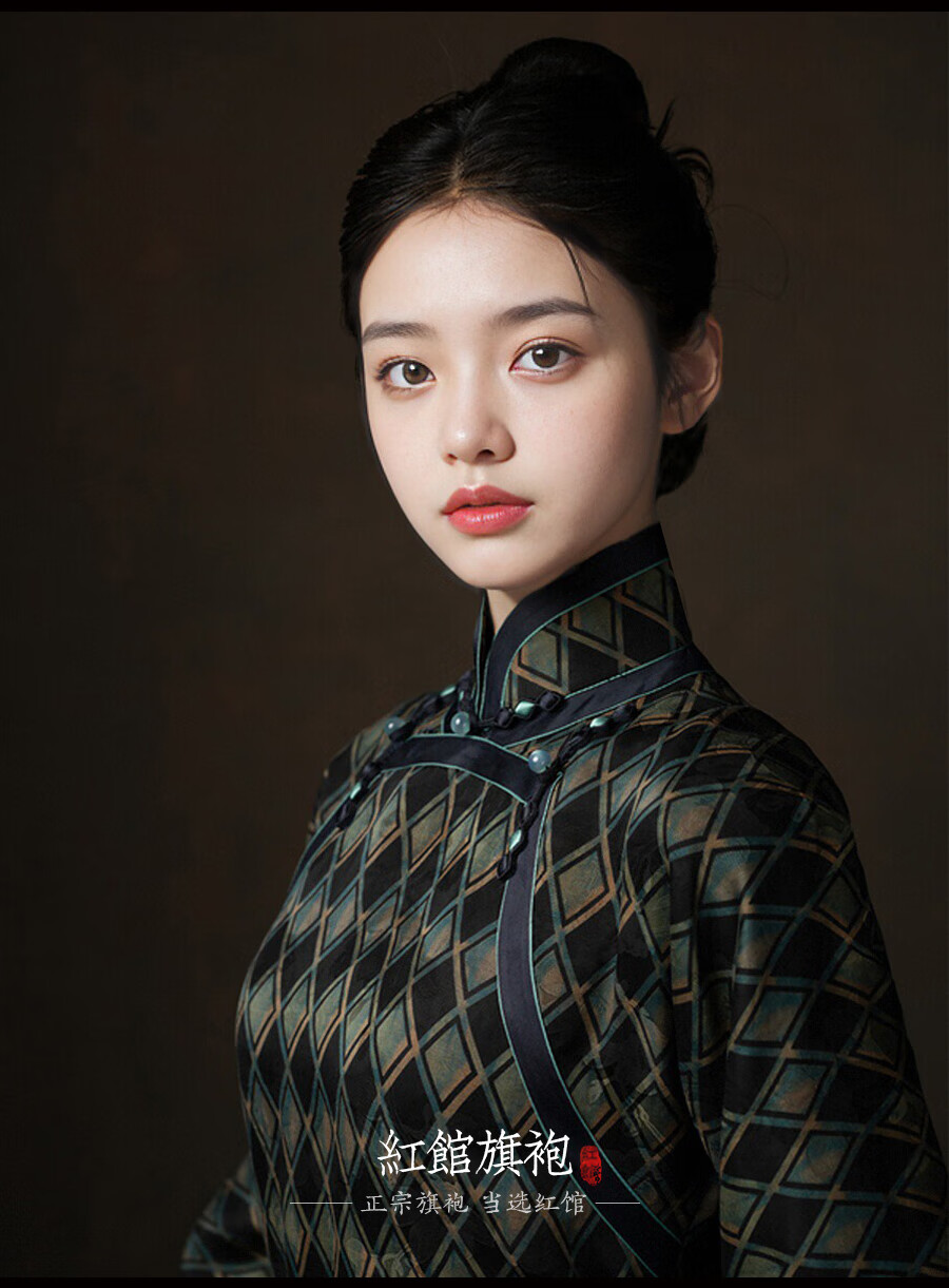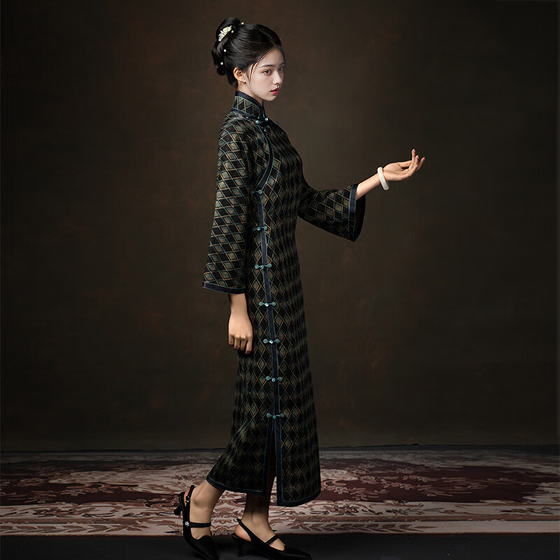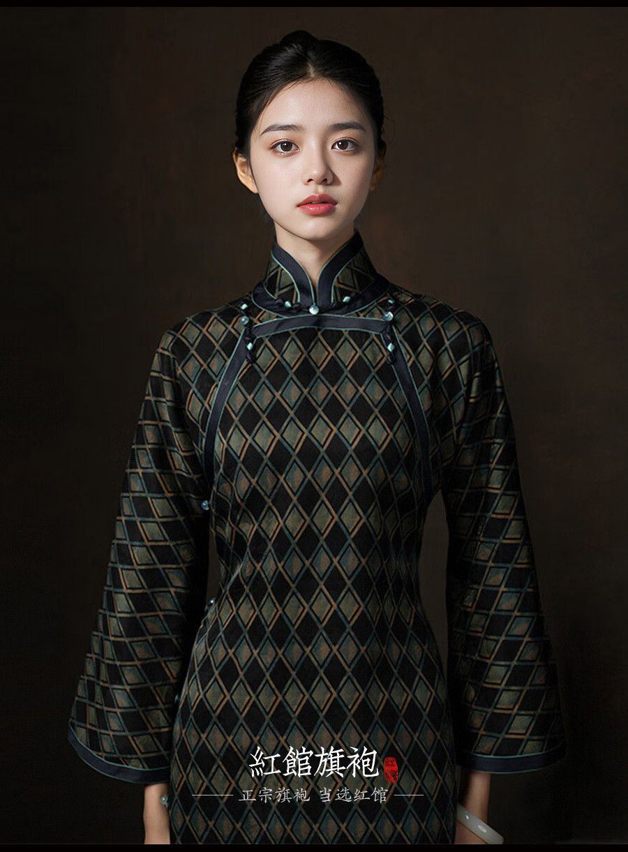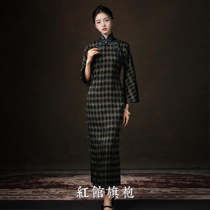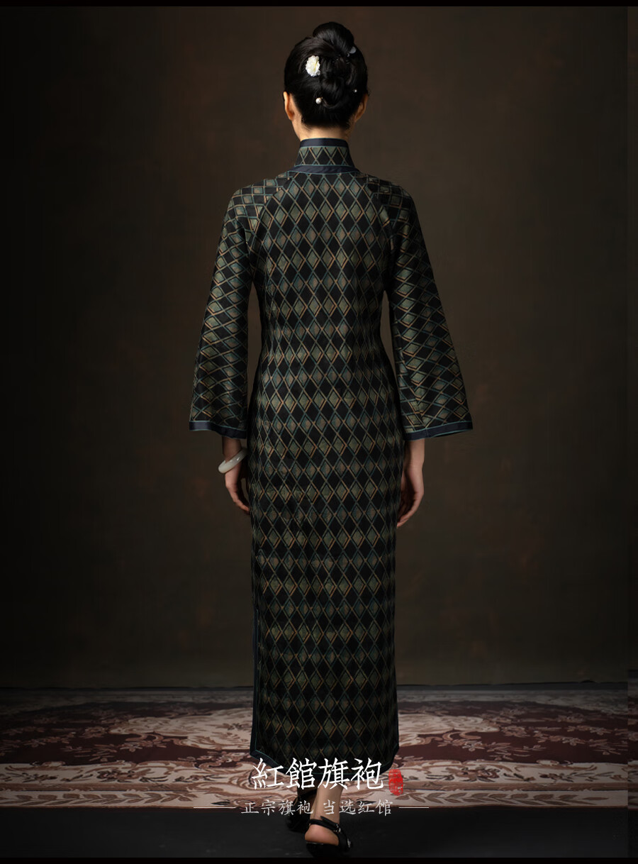 红馆旗袍2025平裁连肩无省收腰真丝提花缎传统复古手工定制旗袍柳条风 绿色 S