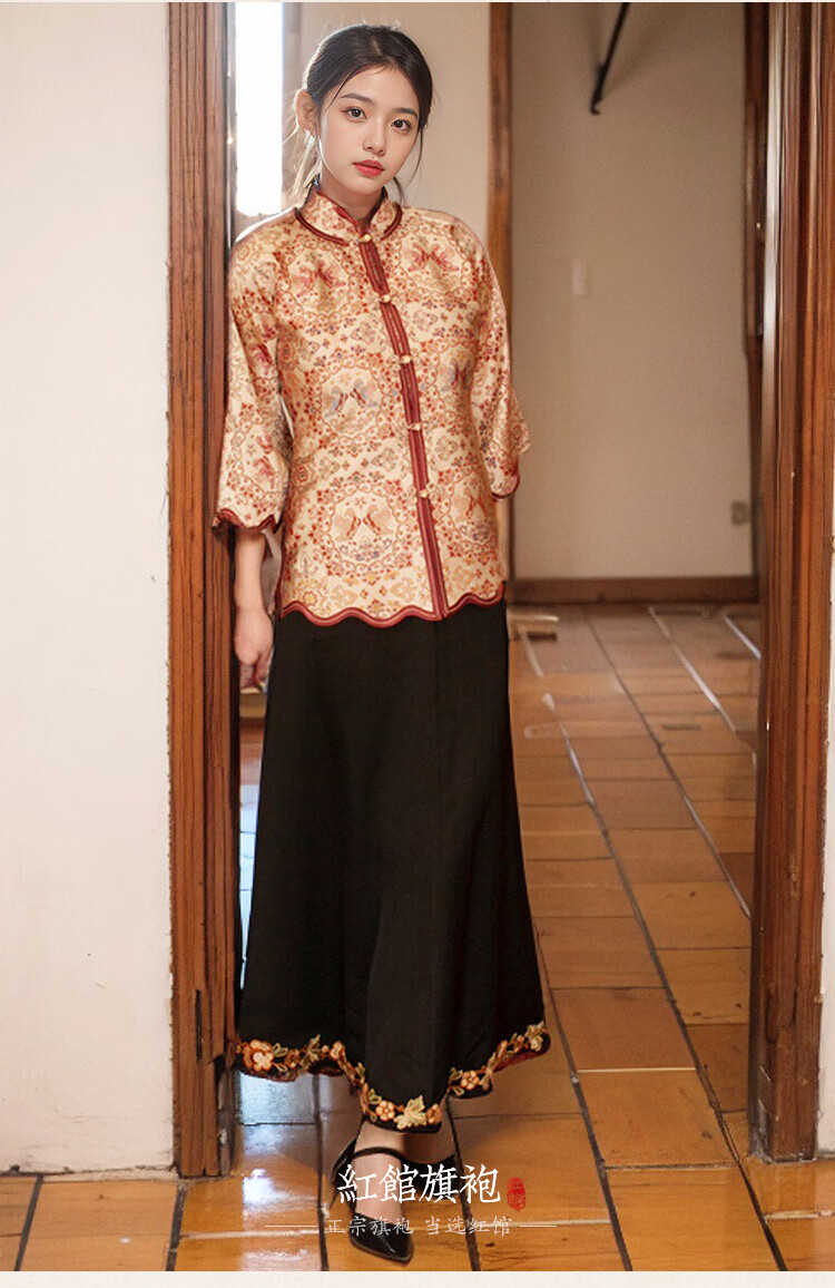 红馆旗袍2025春夏新款旗袍搭配半身裙A字半裙新中式绣花裙秋月凉 黑色 S