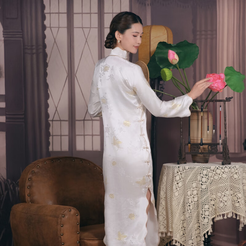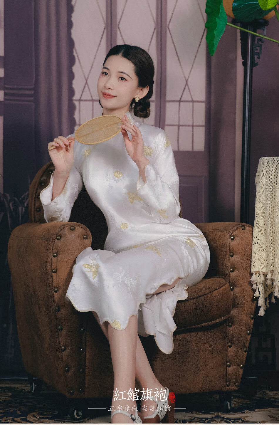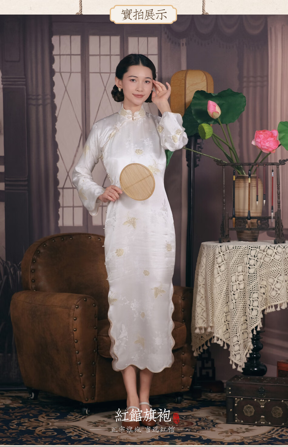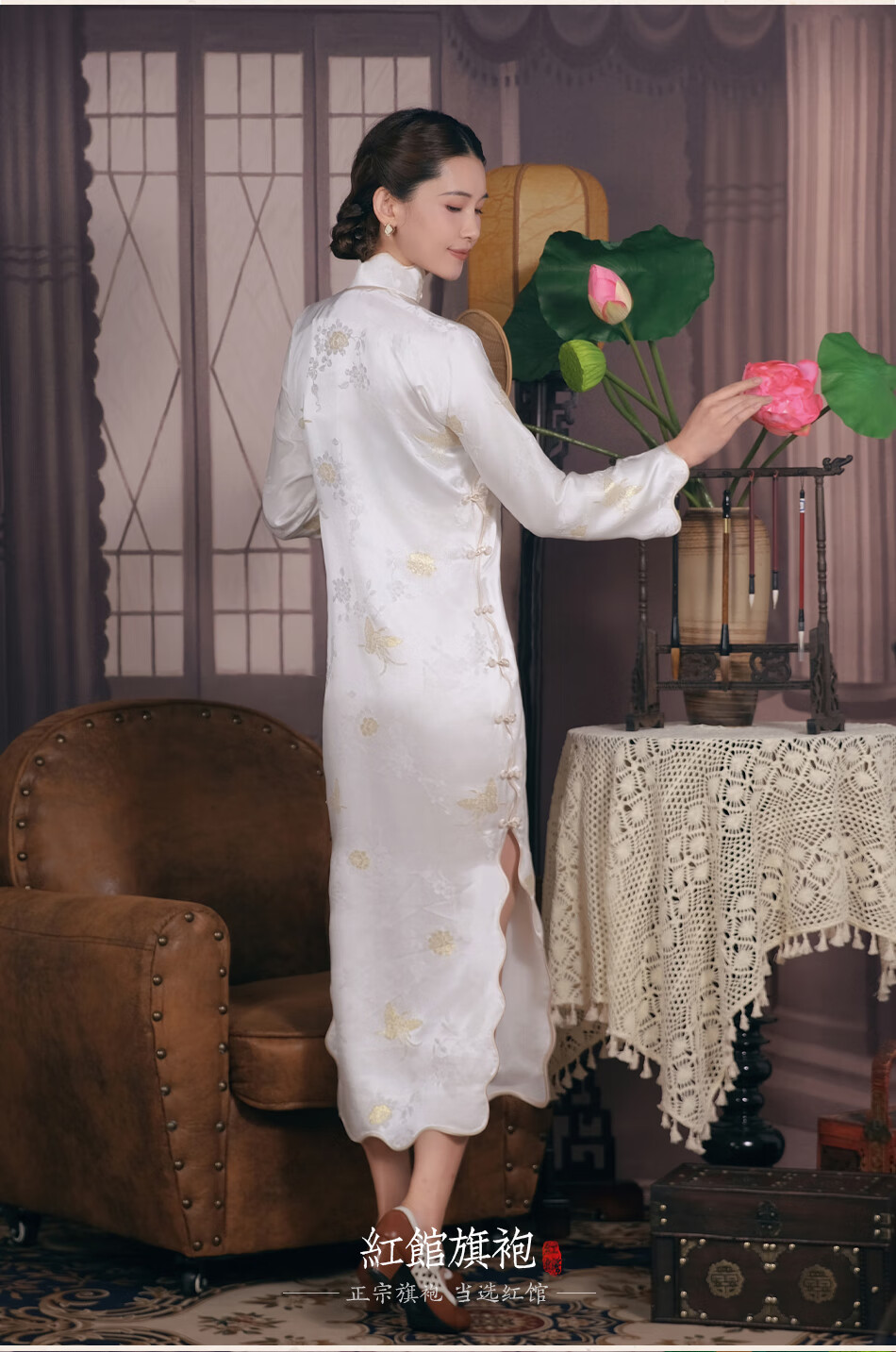 红馆旗袍2025新款春夏织金真丝老料奢华高端老上海品牌长款大码旗袍凤蝶词 白色 S