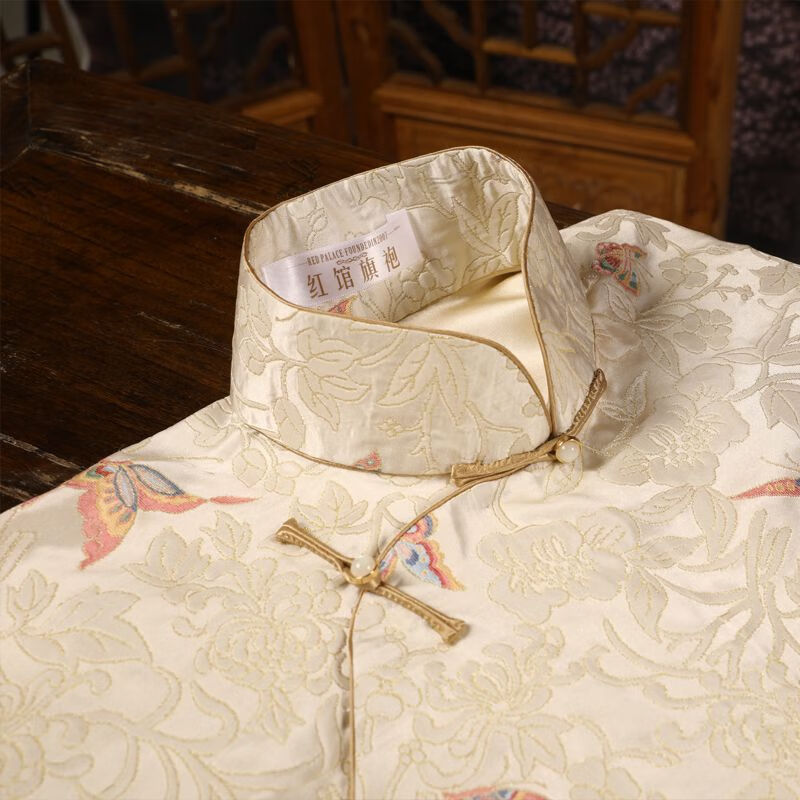 红馆旗袍2025新款春夏织金真丝老料奢华高端老上海品牌长款大码旗袍凤蝶词 白色 S
