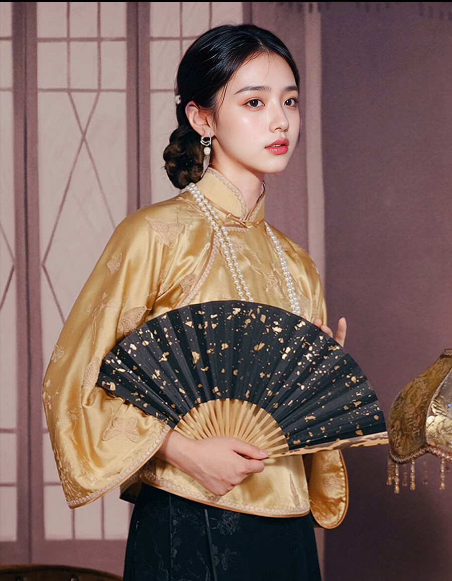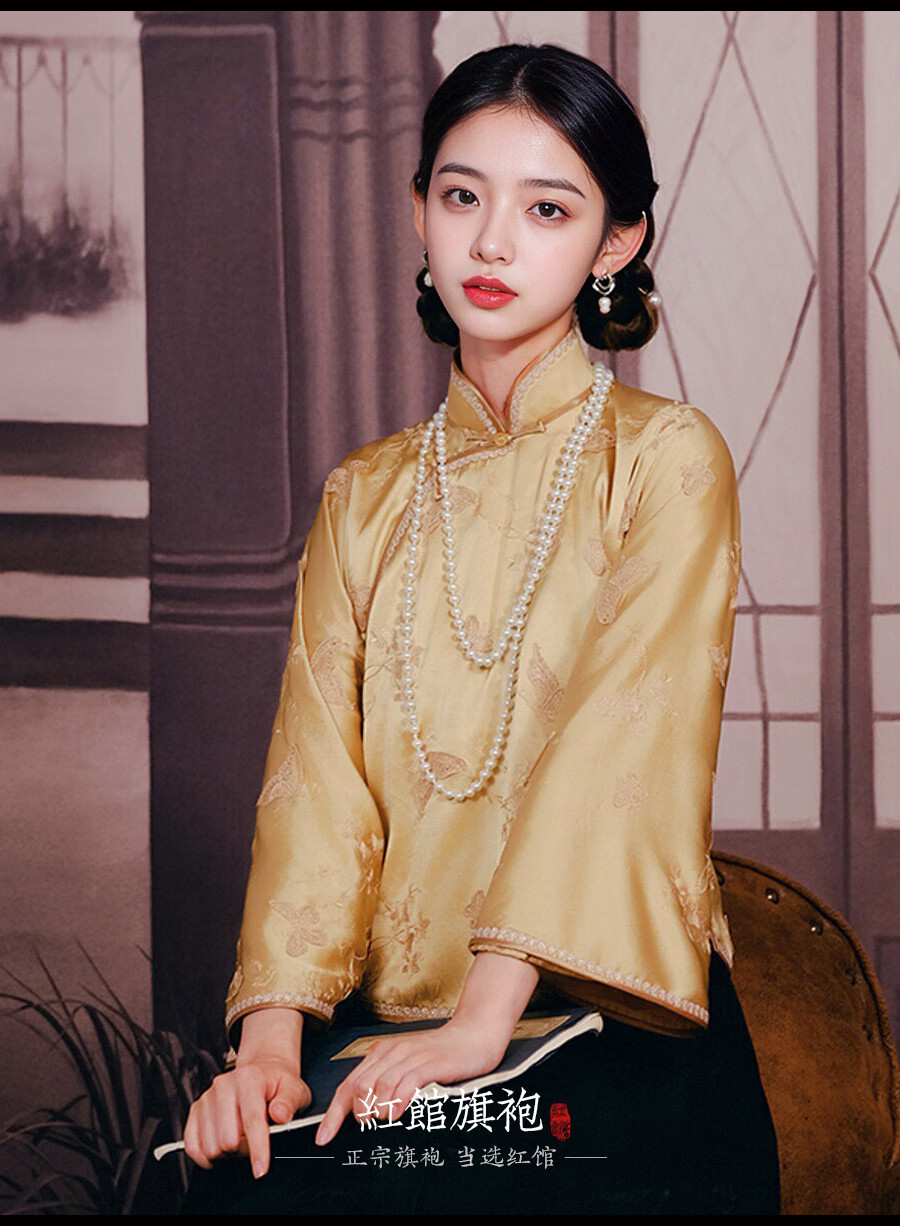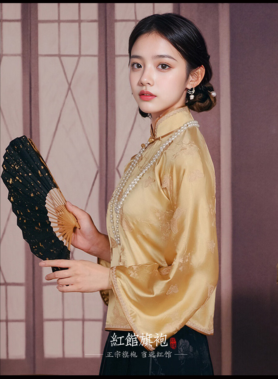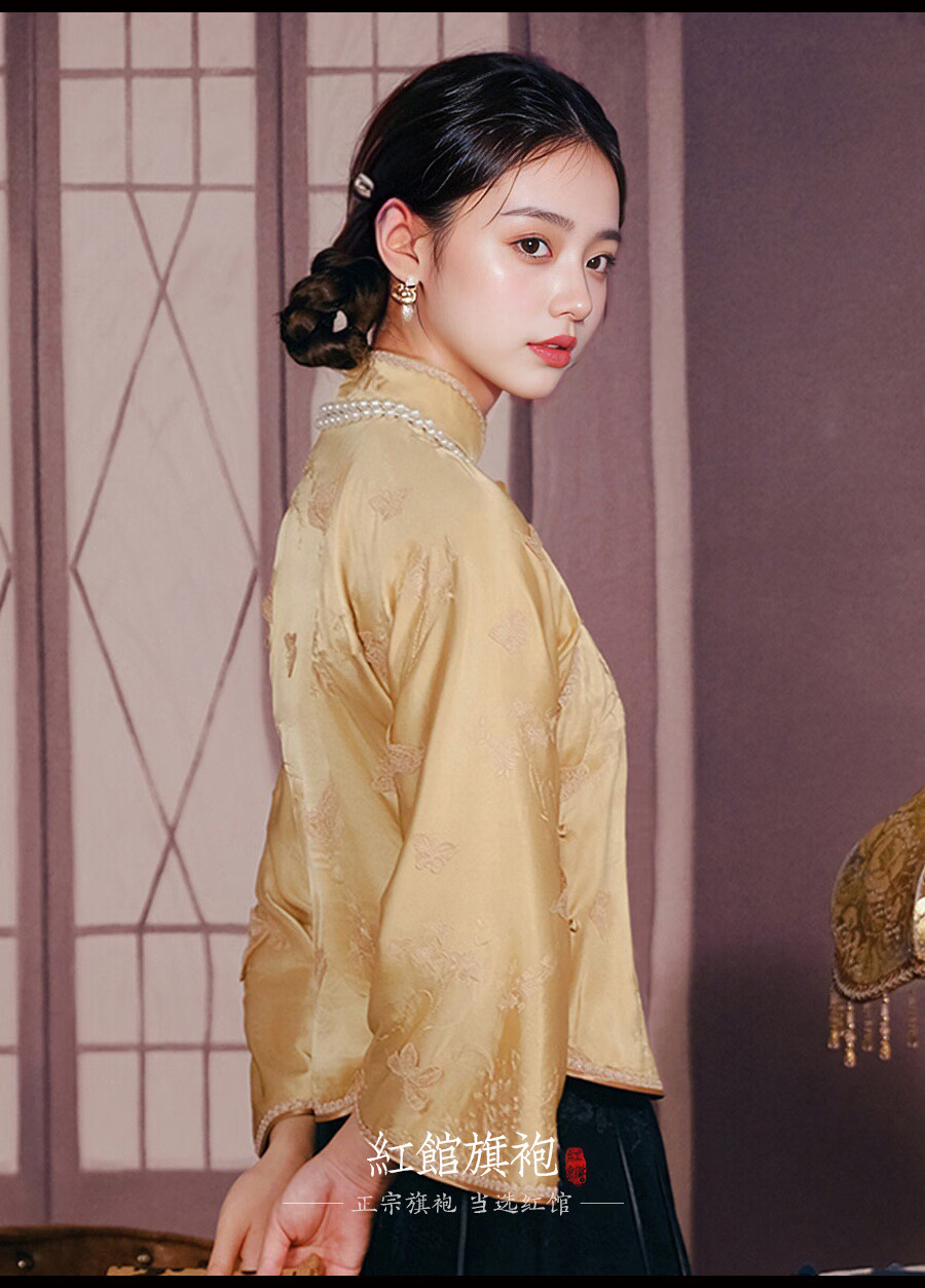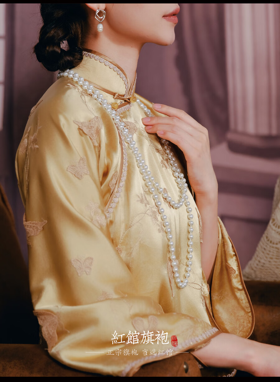 红馆旗袍2025春夏新款马面裙套装新中式倒大袖真丝刺绣绣花显瘦上衣蝶语花 黄色 S