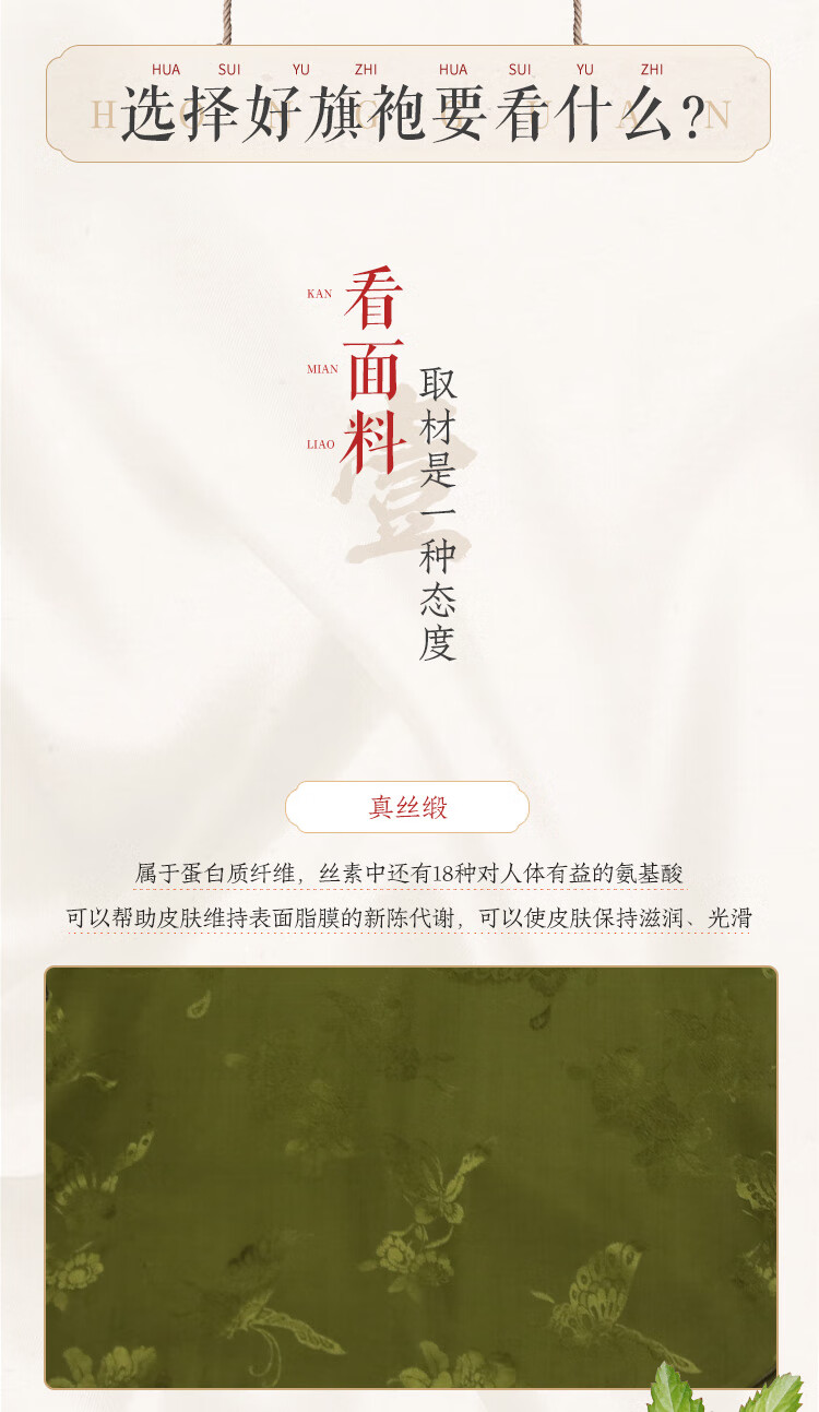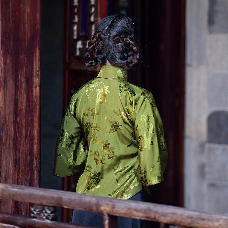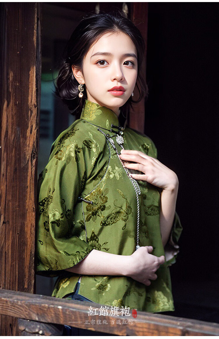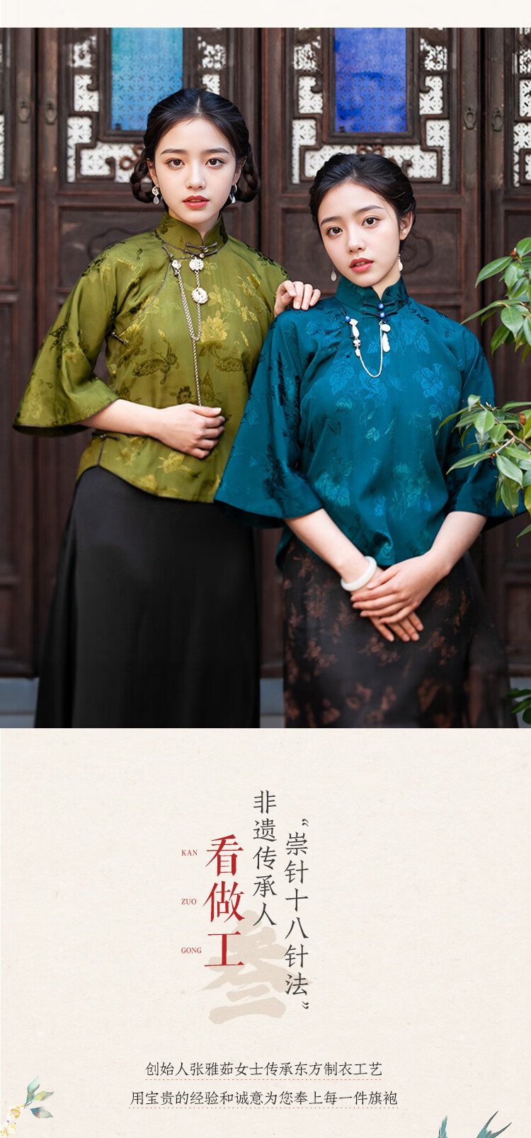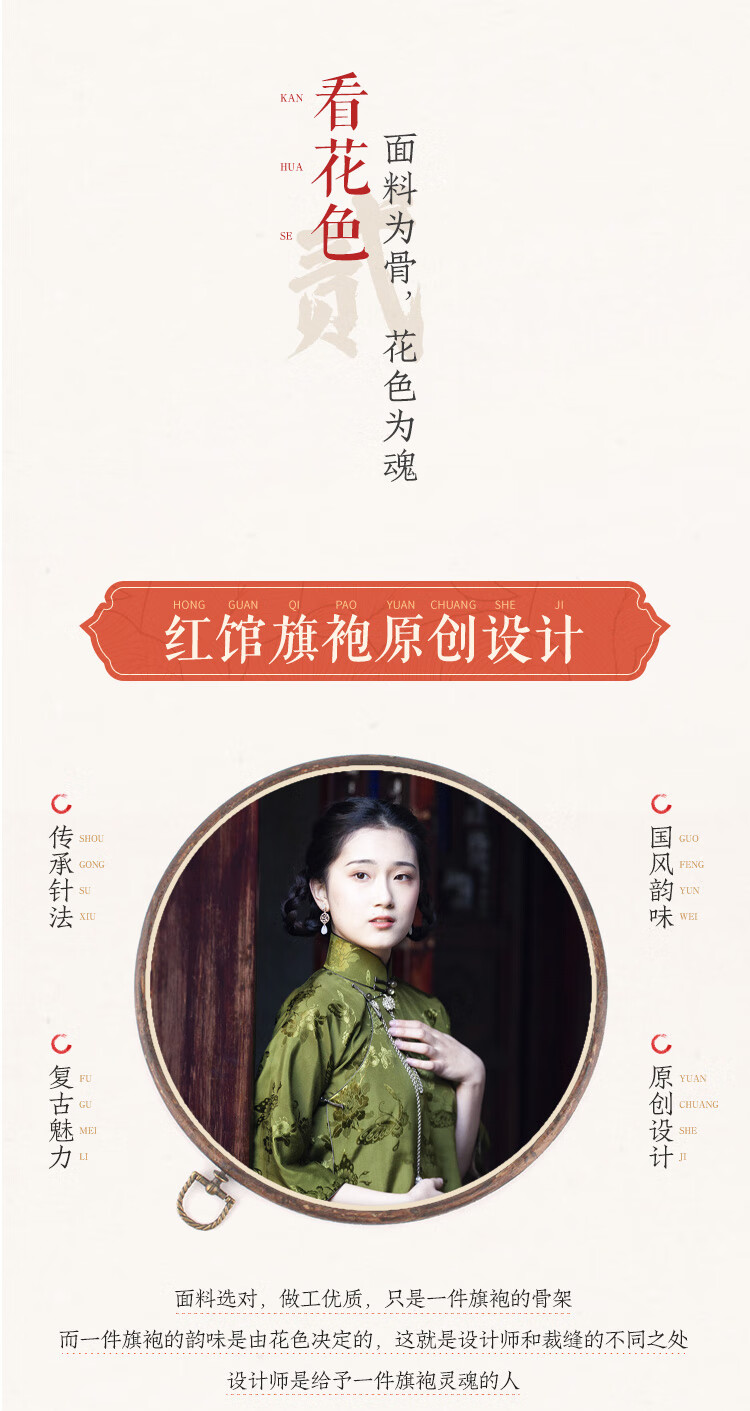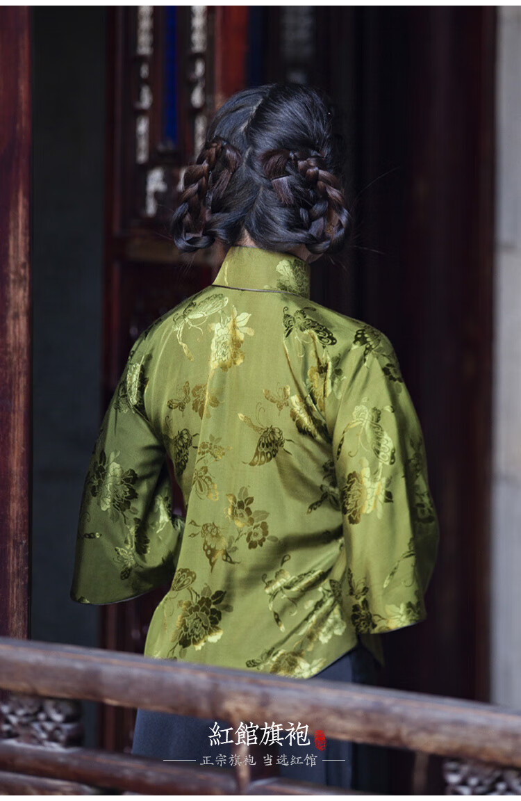 红馆旗袍2025平裁连肩无省收腰真丝提花缎传统复古手工定制旗袍柳条风 绿色 S