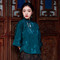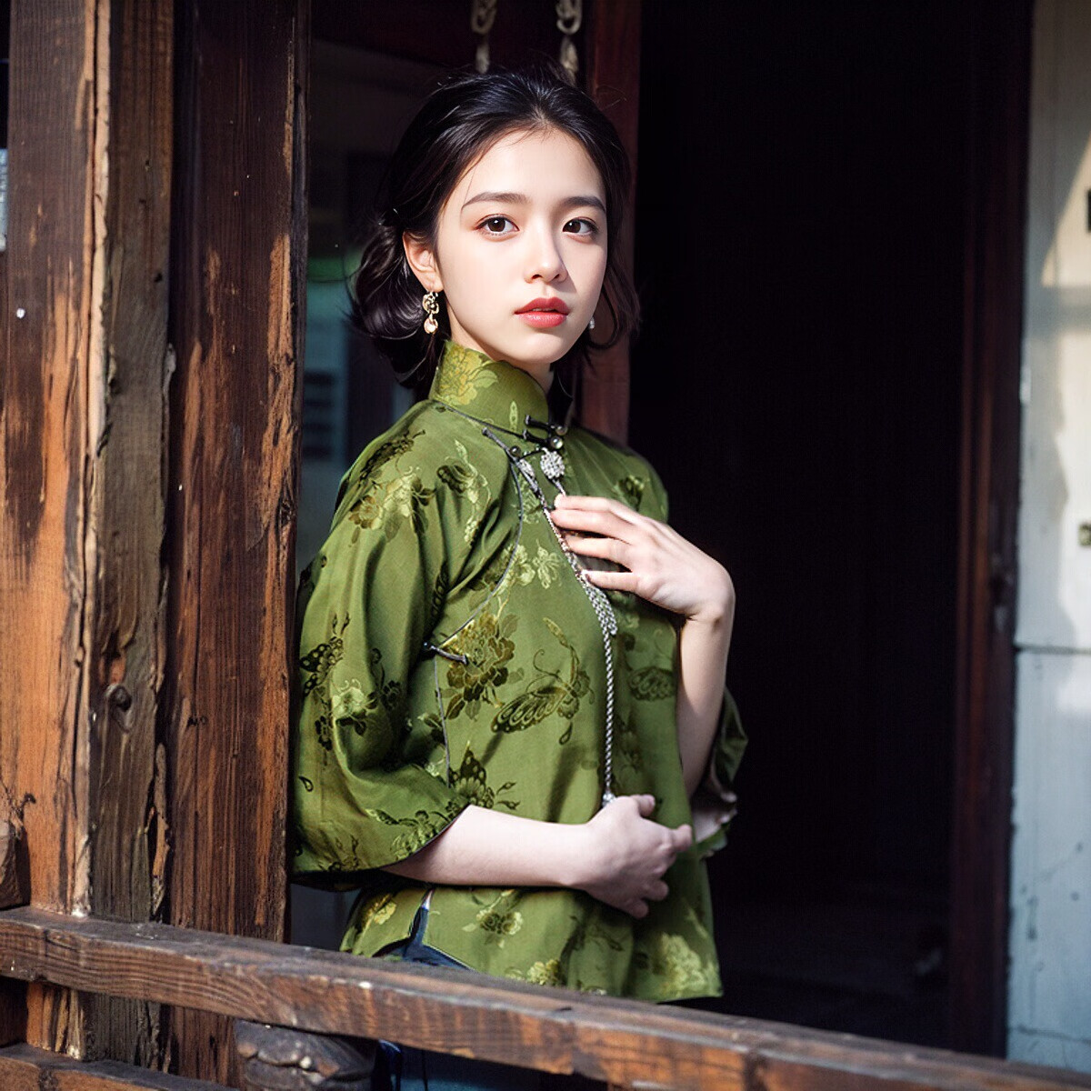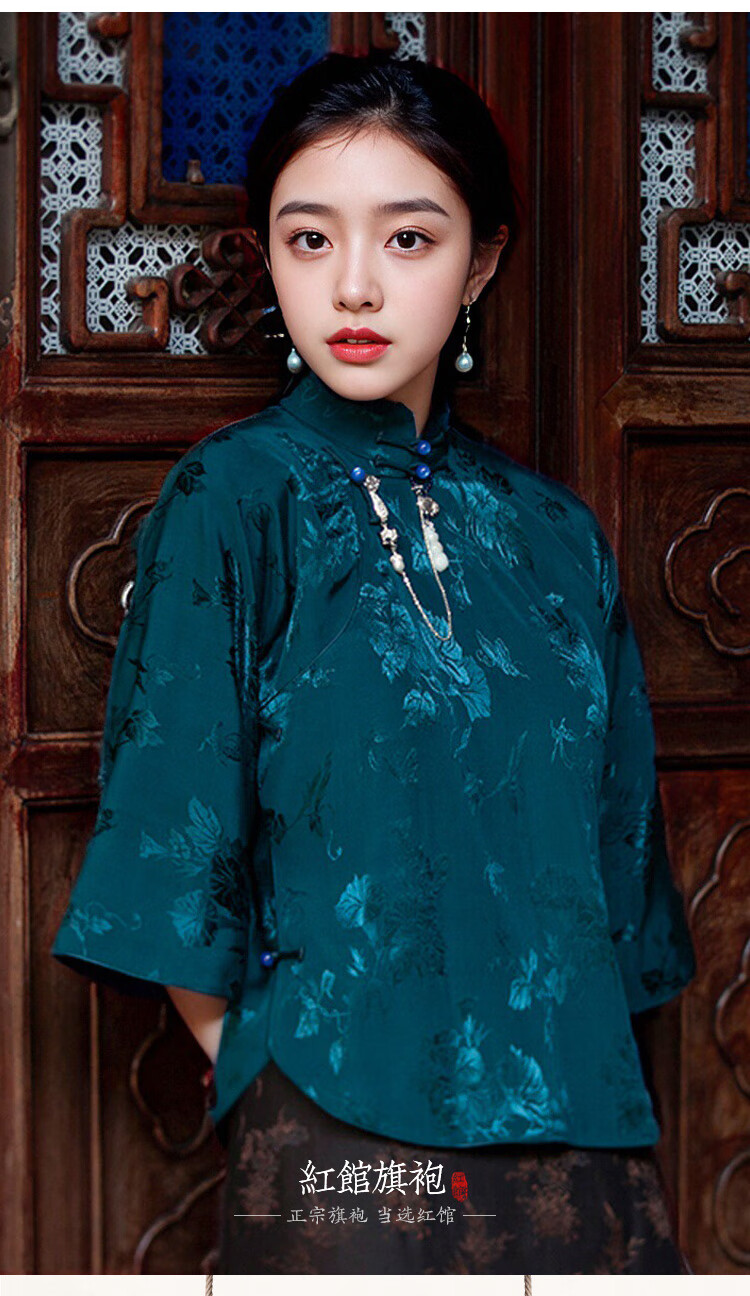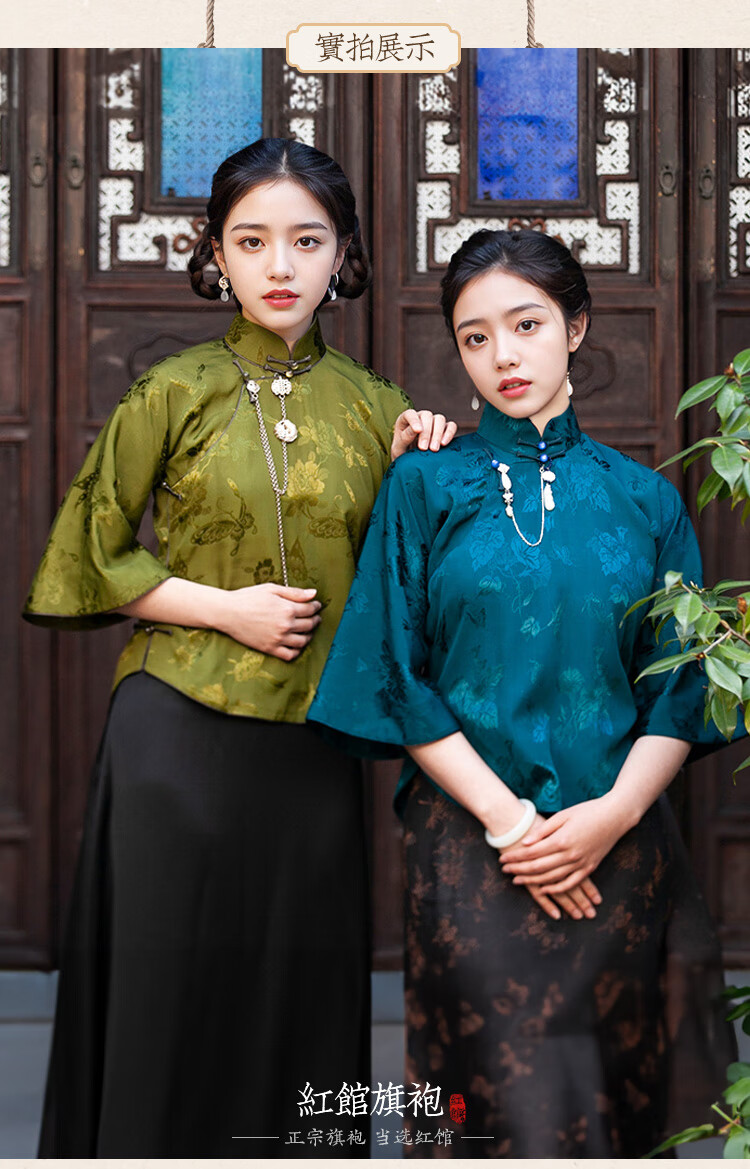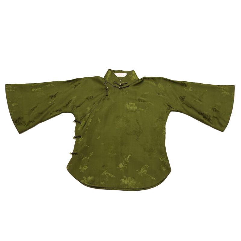 红馆旗袍真丝搭配马面裙一片式古法全开襟平裁国风新中式绿蓝色上衣月在明 草绿色 S