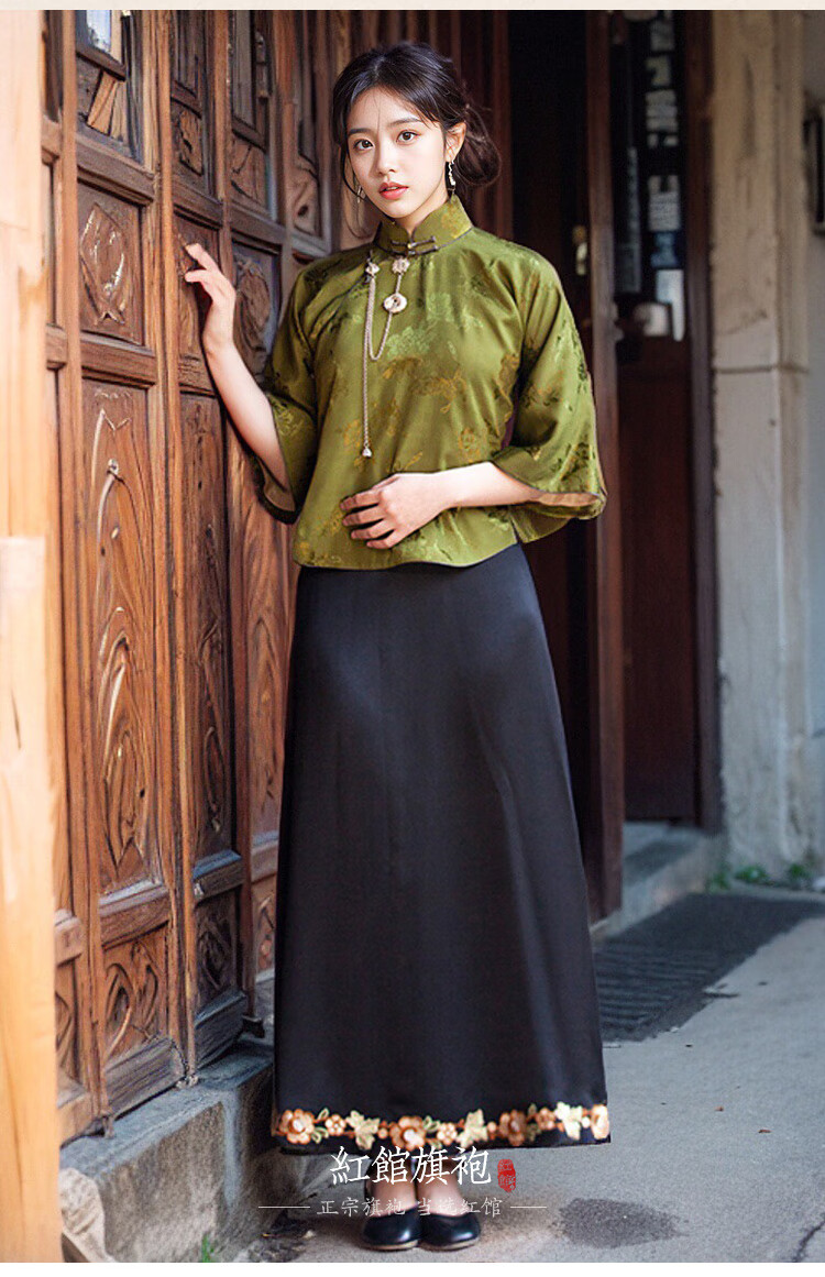 红馆旗袍2025春夏新款旗袍搭配半身裙A字半裙新中式绣花裙秋月凉 黑色 S
