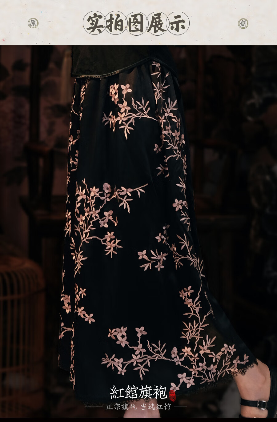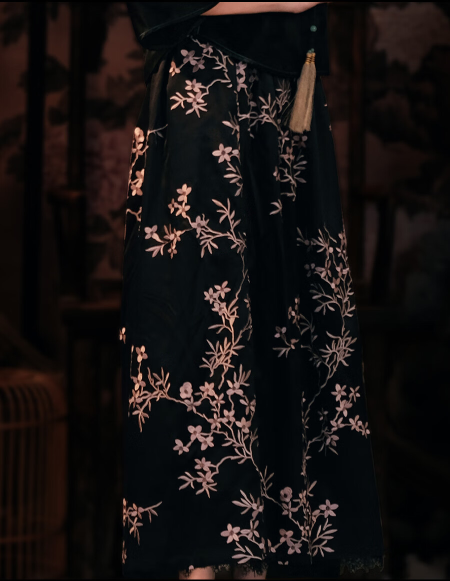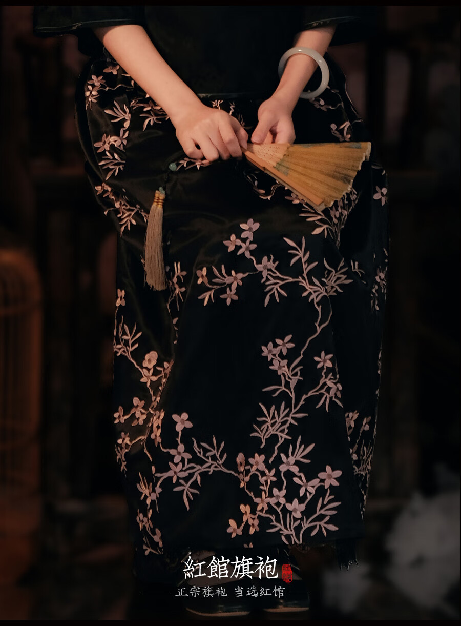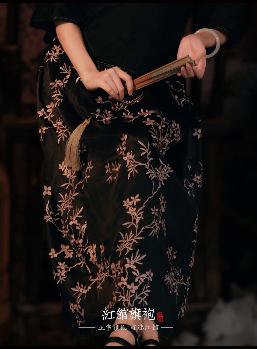红馆旗袍2025春夏新款旗袍搭配半身裙A字半裙新中式绣花裙秋月凉 黑色 S